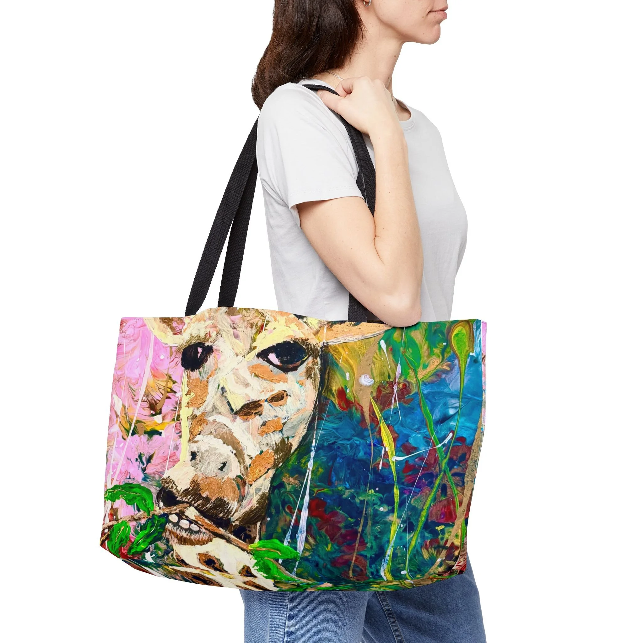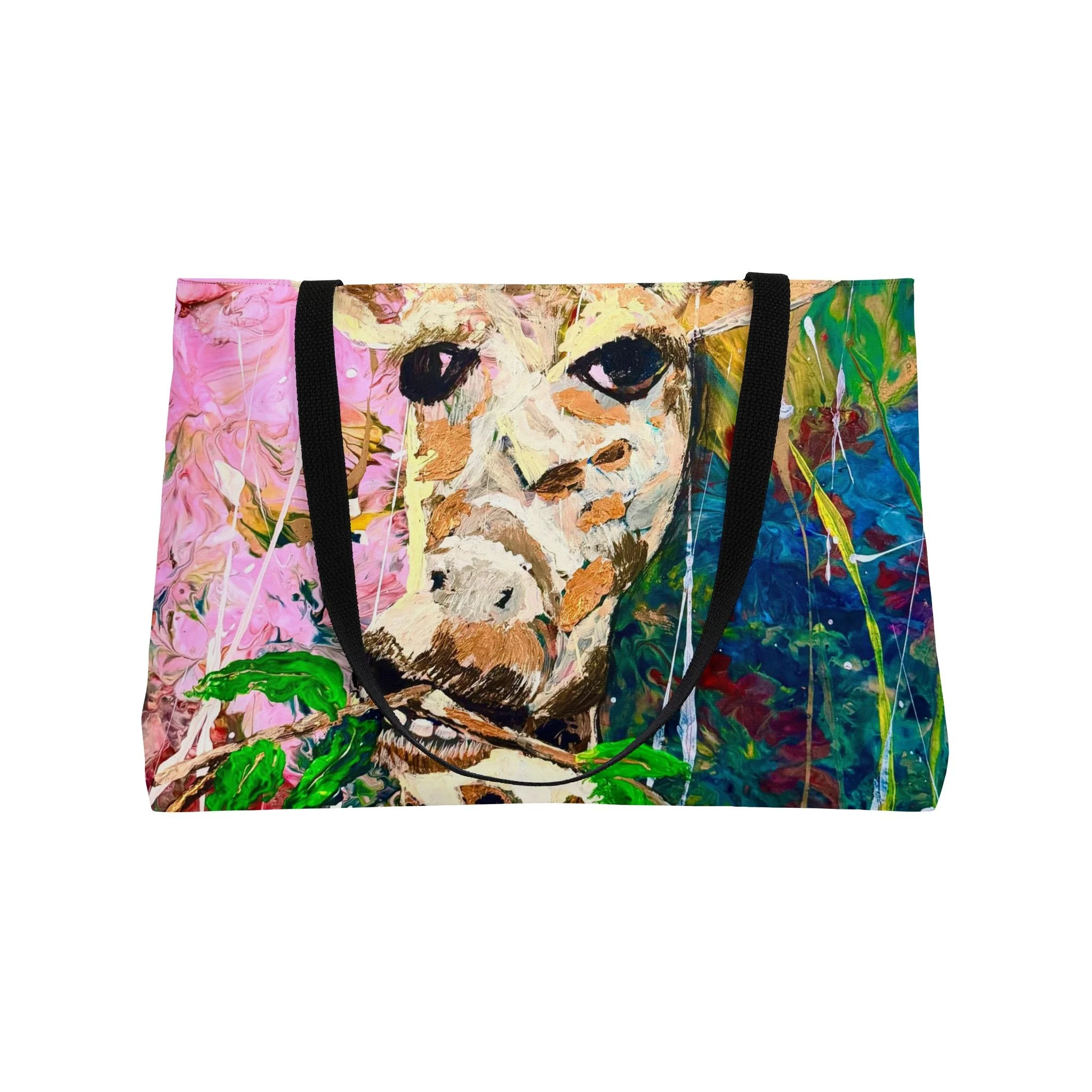 A bright, expressive weekender tote that carries more than things — it carries personality. Hand-assembled in the USA, the roomy 24" x 13" silhouette shows an all-over painterly giraffe motif rendered in vivid, splashy colors. The spun polyester exterior keeps the printed art crisp and wrinkle-free, while a black cotton-poly interior and sturdy black woven handles make the bag feel grounded and ready for travel, market runs, or studio days. The T-bottom gives structure for groceries and ceramics, and the generous size swallows blankets, sketchbooks, or a change of clothes without fuss. Bring a spark of playful, artsy energy to weekend errands, beach escapes, or gallery visits.