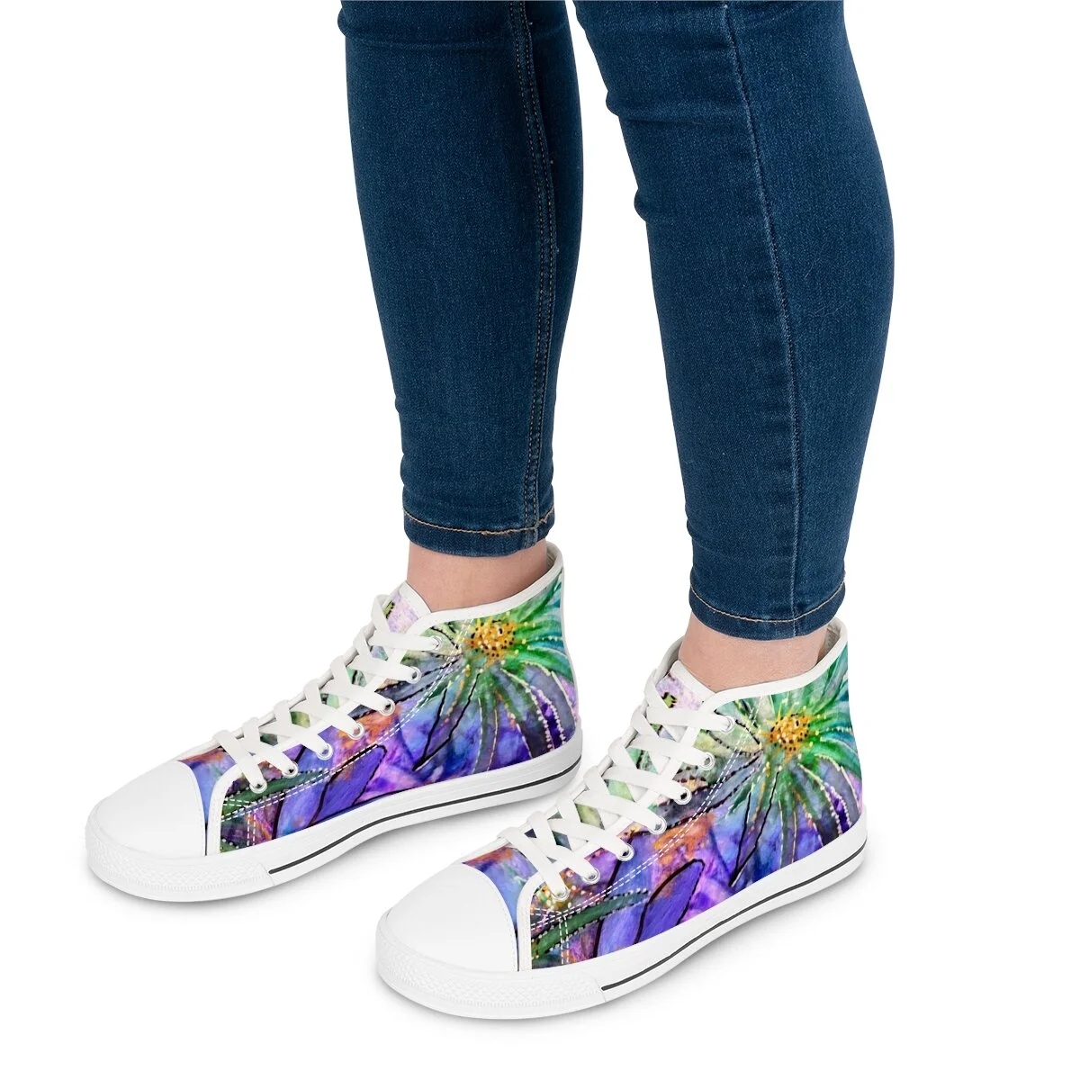 Made with breathable polyester canvas and featuring hi-poly deodorant memory foam insoles, these women's high top sneakers bear all the marks of an awesome shoe. Choose between black or white sole and laces, and enjoy the silver metal eyelets along with the lace-up closure. Add your designs and bring a bespoke staple to life.